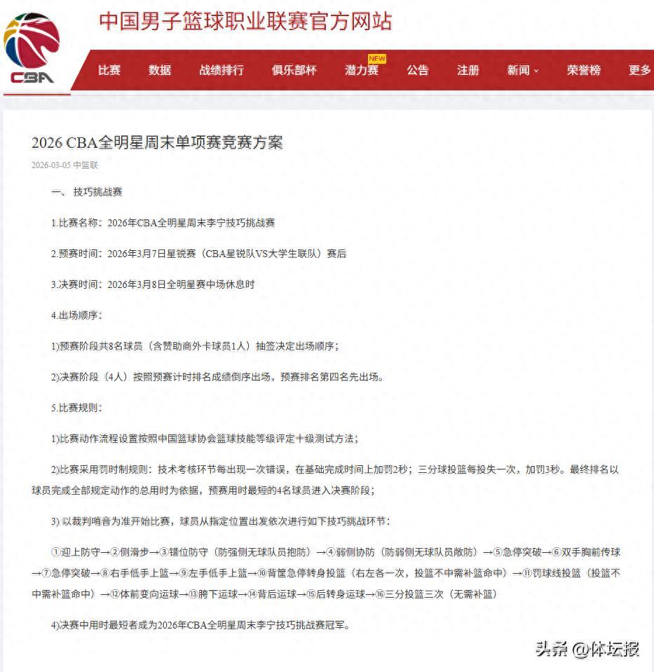 4.決賽中用時最短者成爲2026年CBA全明星週末李寧技巧挑戰賽冠軍。