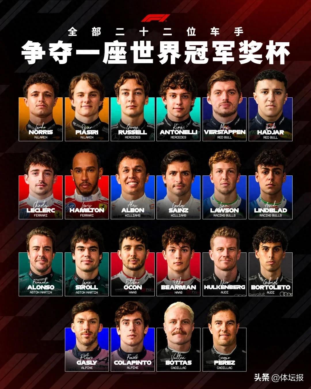 本賽季,圍場內迎來了兩支新車隊。凱迪拉克車隊成爲第11支車隊加入到F1的比賽之中,其兩位車手是廣大車迷們非常熟悉的佩雷茲和博塔斯,中國車手周冠宇則擔任隊中的儲備車手。另一支新車隊則是奧迪,其取代了索伯,正式成爲廠隊。屆時,22臺賽車將同場競技,賽道上的積分競爭無疑更“卷”。