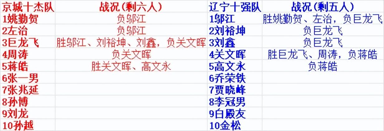 兩隊剩下戰將,按照出場順序,京城十傑隊剩六人,分別是蔣皓、張一男、張兆延、孫博、劉龍、孫越,遼寧十強隊剩五人,依次爲喬榮鐵、賈曉峯、李冠男、白殿友、金松。