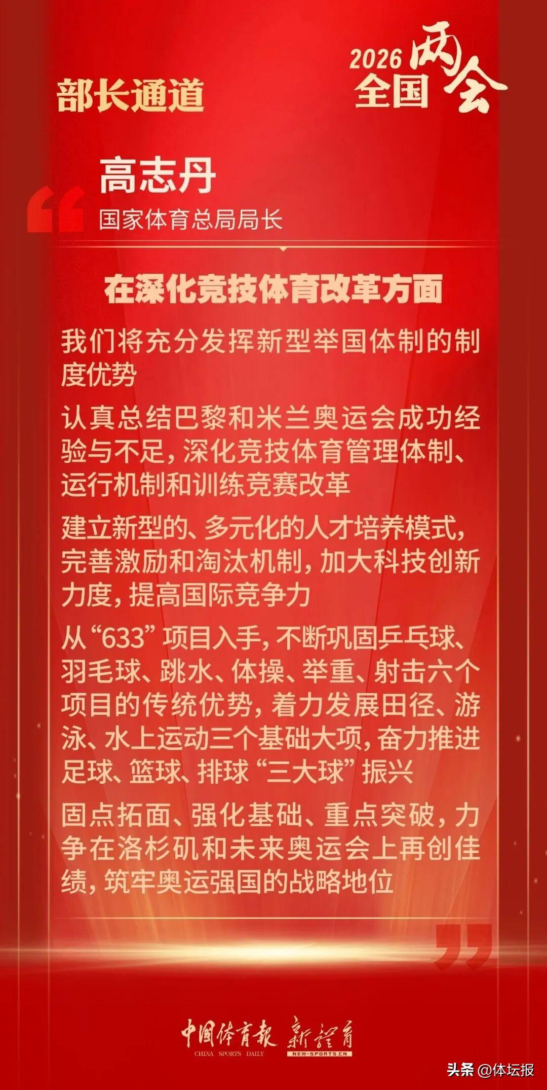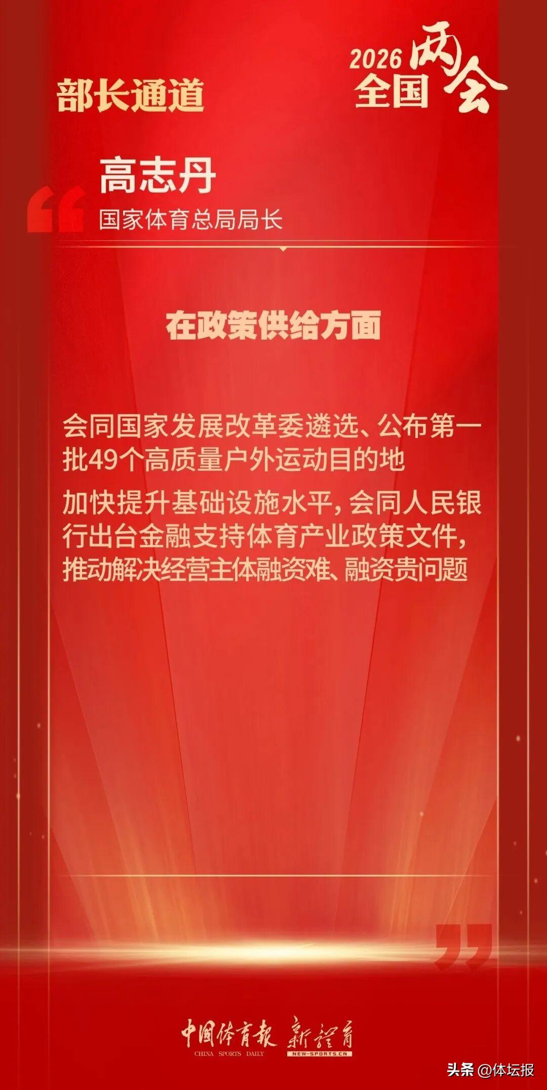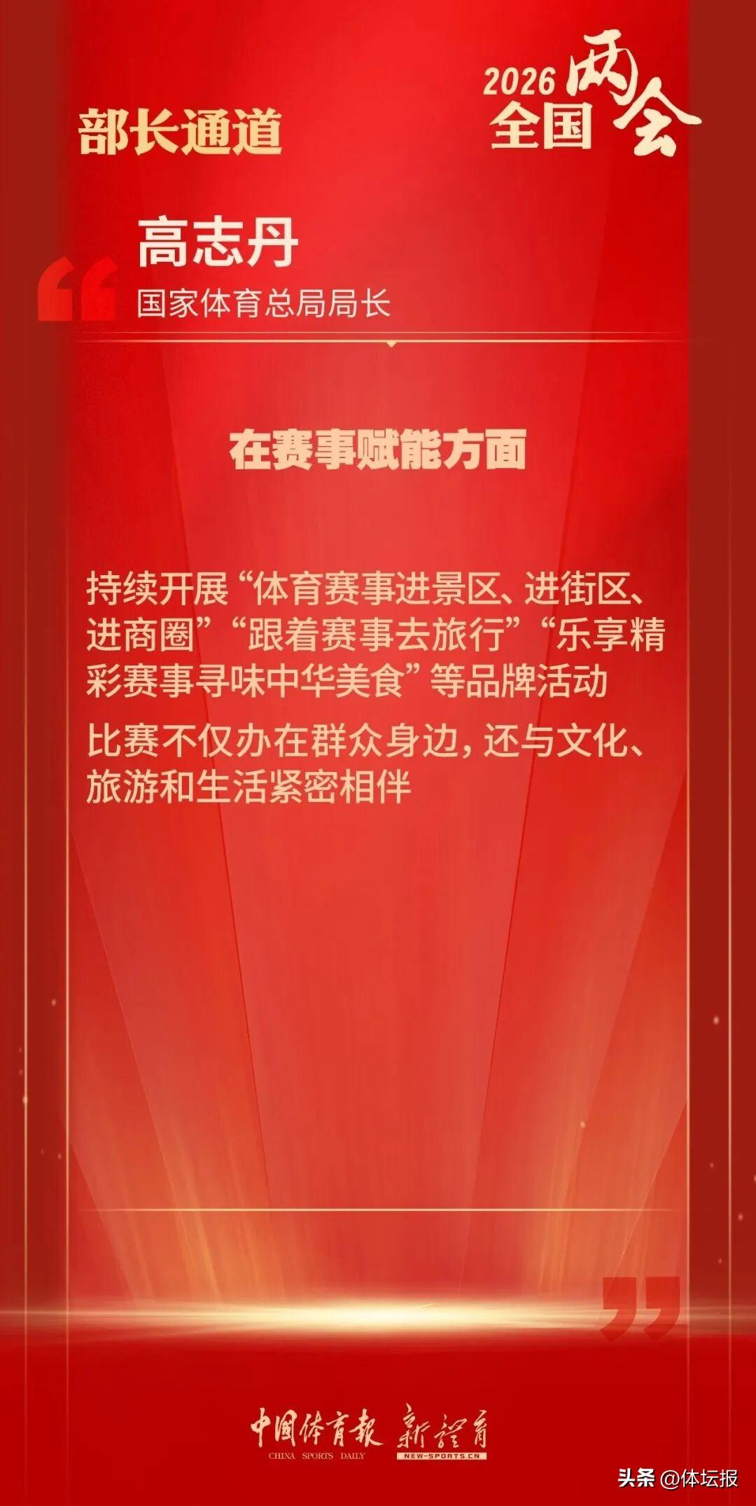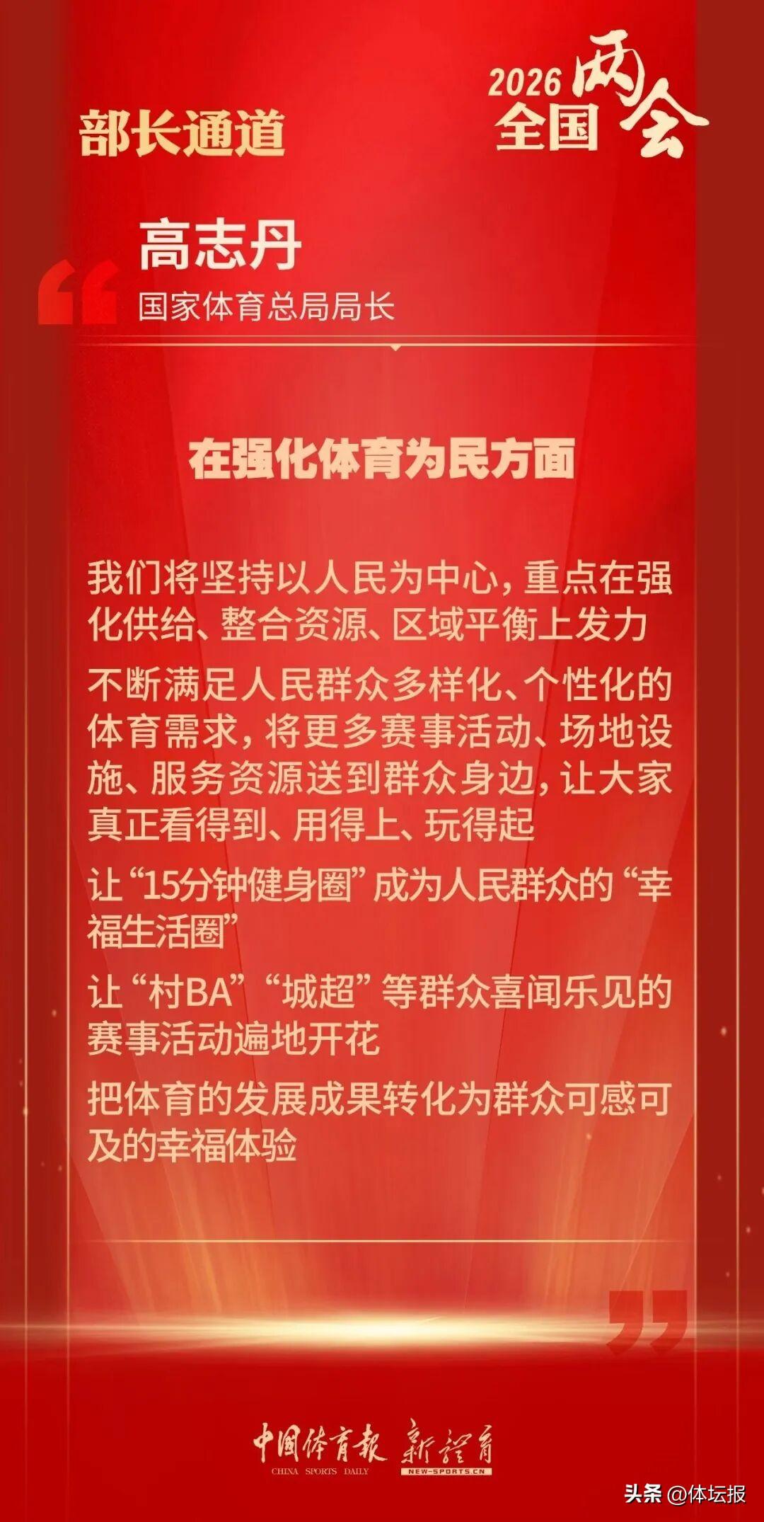 高志丹說,在強化體育爲民方面,將重點在強化供給、整合資源、區域平衡上發力,不斷滿足人民羣衆多樣化、個性化的體育需求,將更多的賽事活動、場地設施、服務資源送到羣衆身邊,讓大家真正能夠看得見、用得上、玩得起,讓“15分鐘健身圈”成爲人民羣衆的“幸福生活圈”,讓“村BA”“城超”等羣衆喜聞樂見的體育活動遍地開花,切實把體育的發展成果轉化爲人民羣衆可感可及的幸福體驗。