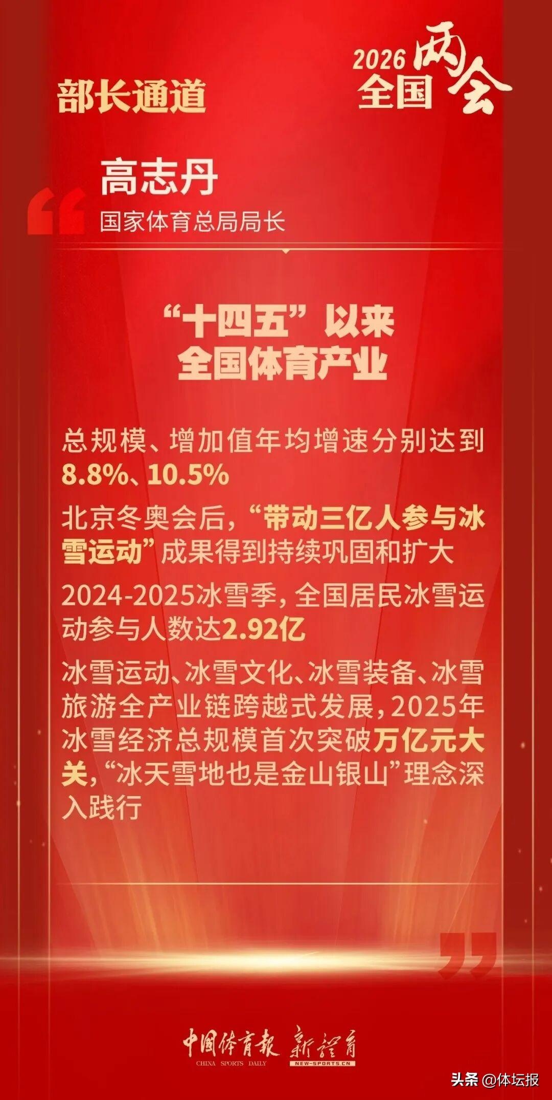 高志丹介紹,“十四五”期間我們錨定體育強國建設目標,取得了一系列新成就,全民健身場地設施持續增多,羣衆體育活動豐富多元,青少年體育蓬勃開展,北京冬奧會、杭州亞運會、巴黎奧運會、哈爾濱亞冬會連創歷史佳績,粵港澳聯合承辦全運會。體育產業規模逐年快速攀升。