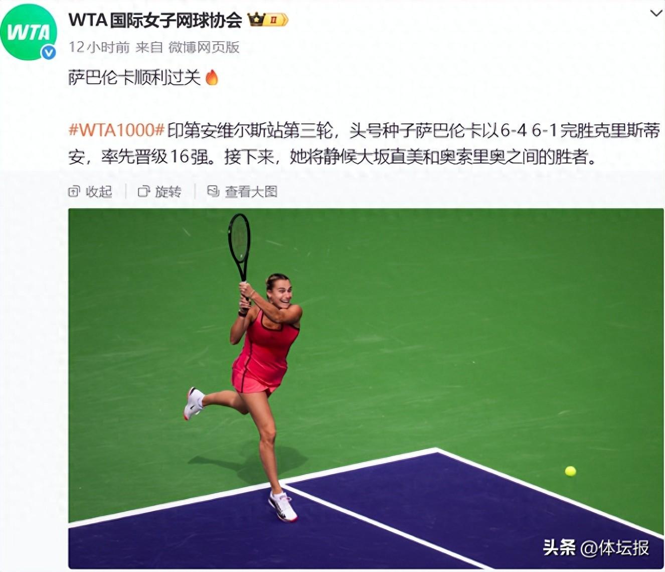 據WTA國際女子網球協會消息,WTA1000印第安維爾斯站,薩巴倫卡和大坂直美將在第四輪比賽隔網相對,爭奪一個八強名額。