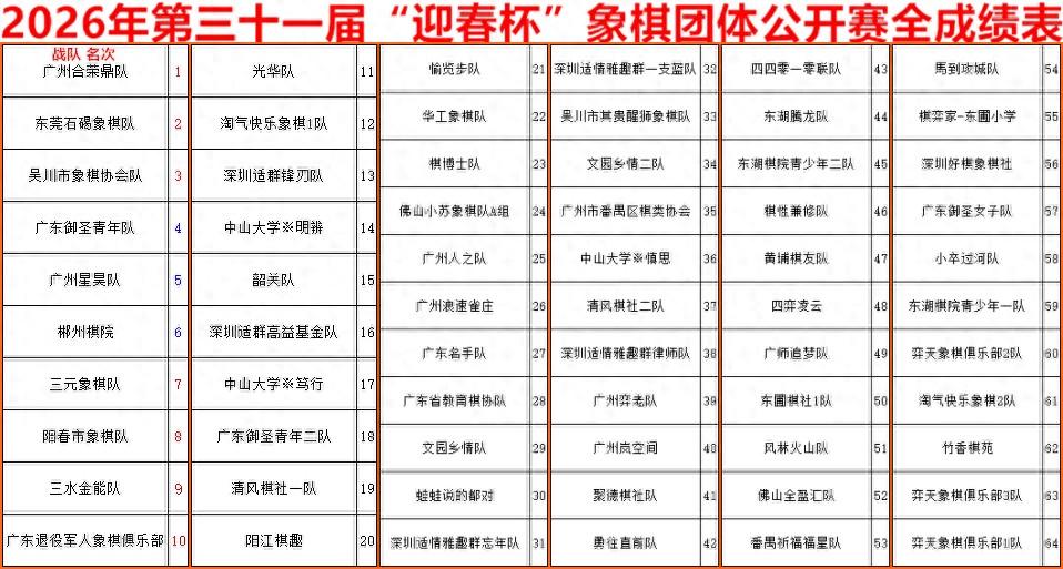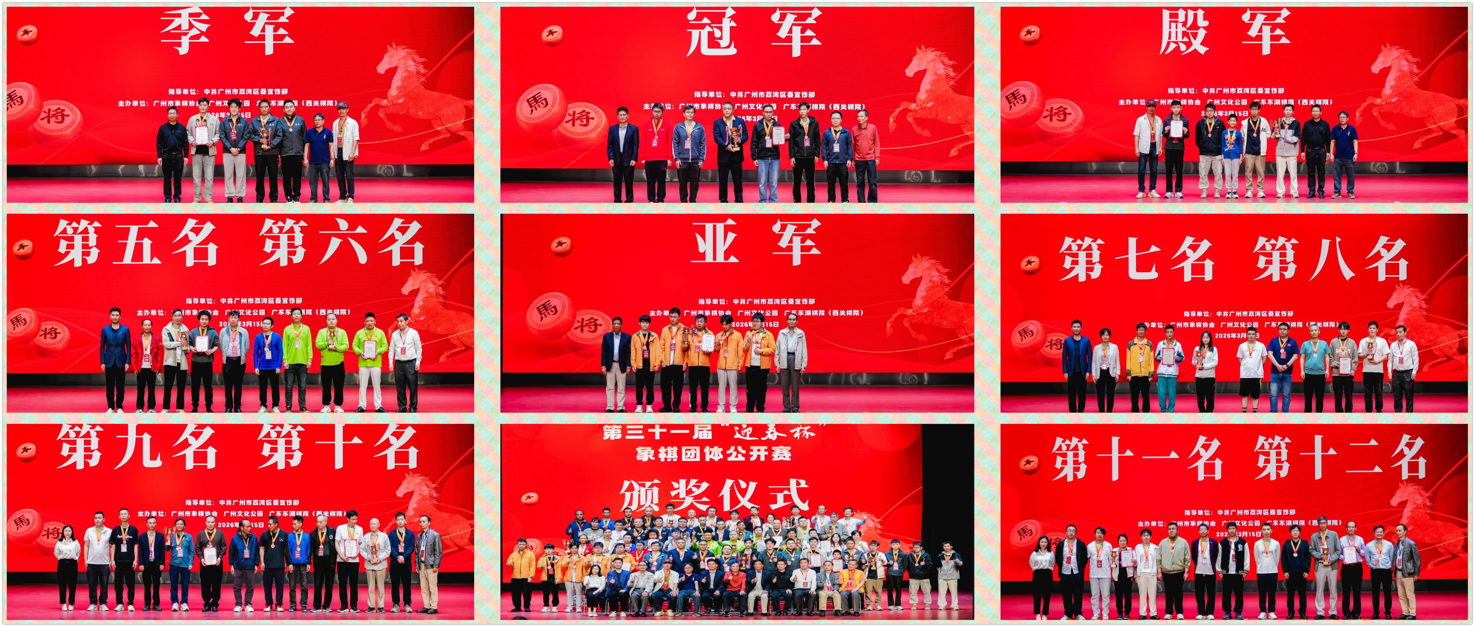 恭賀2026年第三十一屆“迎春杯”象棋團體公開賽圓滿成功,祝賀廣州合榮鼎隊勇獲總冠軍,加冕王座,榮膺金盃,賀喜優秀獲獎隊伍,爲迎春杯大賽和衆棋手鼓掌,點贊,喝彩!