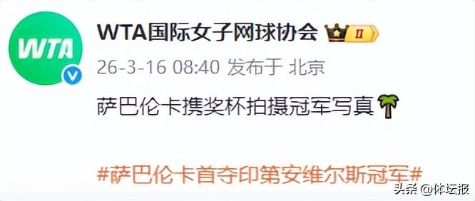 北京時間3月16日凌晨,WTA1000印第安維爾斯站女單決賽中,頭號種子薩巴倫卡與3號種子萊巴金娜再次相遇,最終,薩巴倫卡挽救賽點以3-6、6-3、7-6(6)逆轉復仇3號種子萊巴金娜,終結了對後者的決賽四連敗,三次闖入本站決賽終於捧杯,將一座新的冠軍獎盃加入收藏。這也是她職業生涯的第10個1000賽的冠軍。