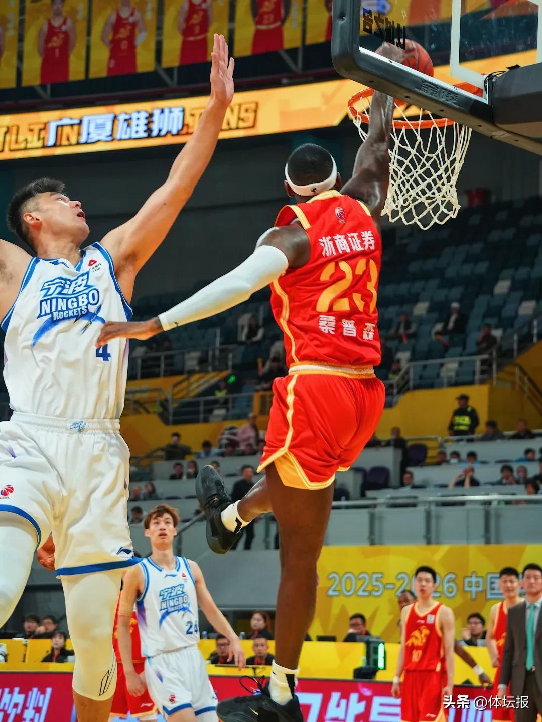 不過,在塔克的帶領下,浙江浙商證券逐漸穩住陣腳並反超比分,寧波町渥也犯規到數。隨着兩隊防守強度的上升,球員們的失誤開始增多,站上罰球線也變得頻繁。隨着趙嘉仁命中壓哨上籃,浙江浙商證券首節戰罷以24比23領先。