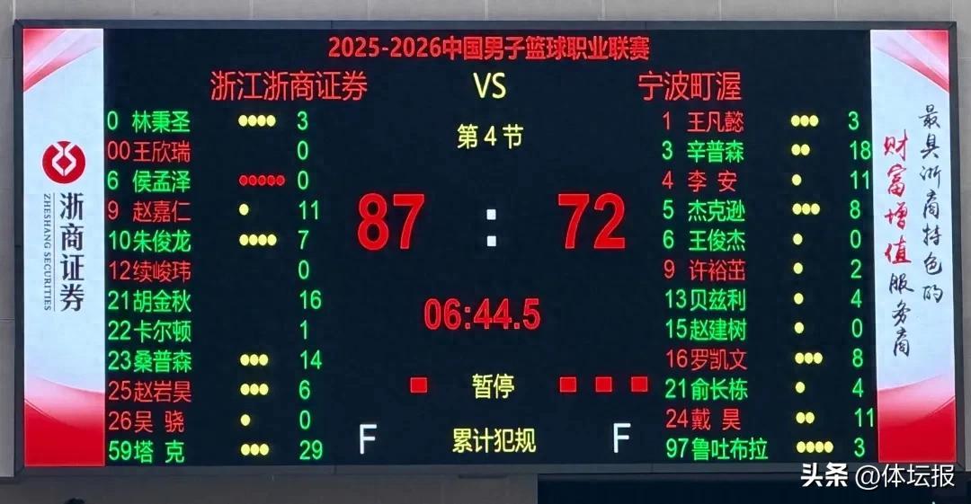 下半場開打,辛普森挑籃得手,朱儁龍也強突籃下命中。塔克雖然三罰僅一中,但朱儁龍積極補籃造成了貝茲利的干擾球,打成了一次1+2。隨後,塔克又一次抓住轉換機會打中,眼看分差就要往兩位數去,寧波町渥只能叫停。