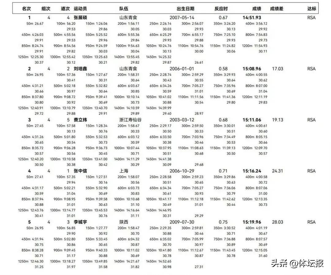 在當天最後一場比賽男子1500米自由泳中,山東隊“小孩哥”張展碩以14分51秒93刷新個人最佳成績獲得金牌,山東選手劉培鑫以15分08秒96獲得銀牌,浙江選手費立緯以15分11秒06獲得銅牌。