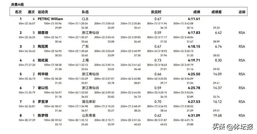 當天,男子400米個人混合泳A組決賽中,佩特里克·威廉憑藉均衡的泳姿佔據優勢,全程領跑並最終奪冠。浙江18歲小將顧恩翊以4分17秒83刷新個人最佳成績,獲得銀牌,廣東選手陶冠男獲得銅牌,浙江選手謝以忱位列第六。