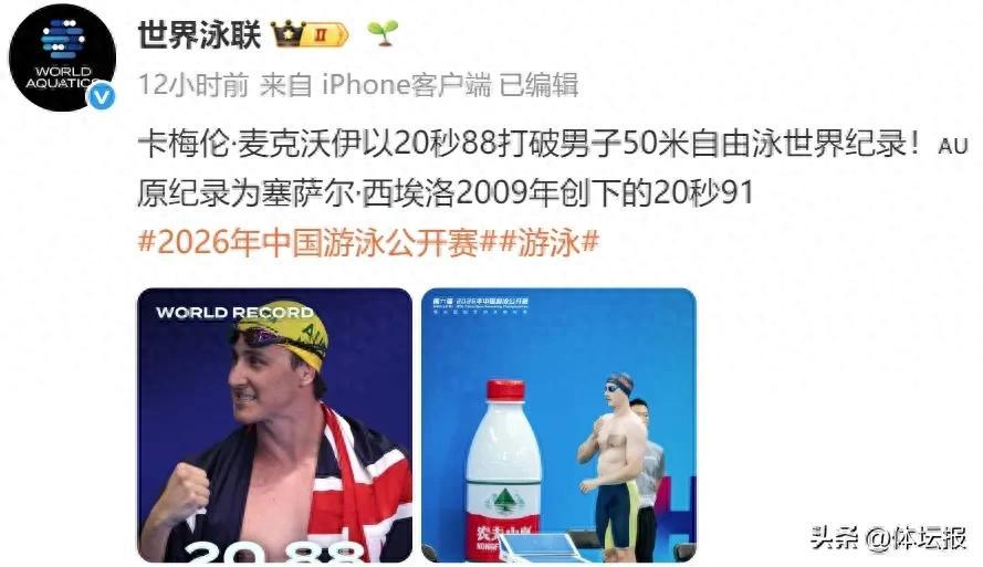 3月20日晚,2026中國游泳公開賽暨全國春季游泳錦標賽在深圳大運中心遊泳館第二個比賽日,澳大利亞選手卡梅倫·麥克沃伊游出20秒88的驚人成績,強勢打破男子50米自由泳世界紀錄,一舉摘得金牌,爲這場高水平國際泳壇盛會鐫刻下濃墨重彩的歷史一筆。