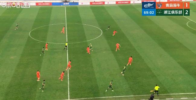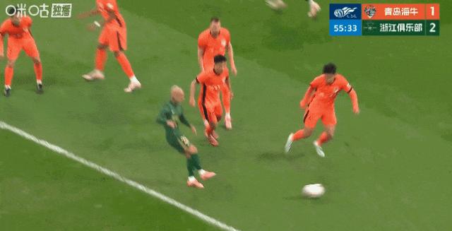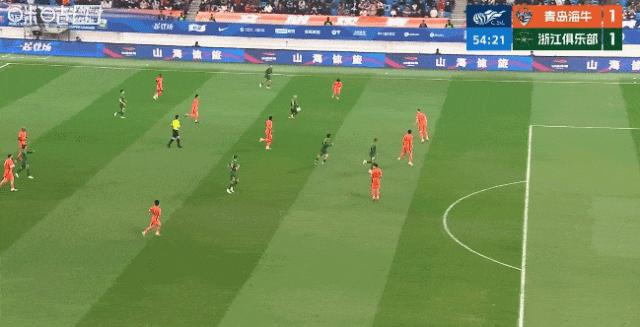 易邊後,綠城隊在進攻端重新組織火力,向青島海牛的大門頻頻發出威脅。在這種高強度的進攻下,青島海牛的防線終於在第54分鐘被打穿,米特里策單人獨騎闖入禁區,隨後橫傳助攻王鈺棟破門得手,幫助隊伍扳平比分。