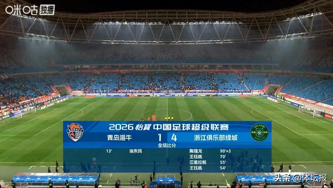 3月20日晚,中超第三輪聯賽展開積分爭奪。本輪比賽,浙江綠城隊做客山東,對青島海牛發起挑戰。最終,憑藉王鈺棟的梅開二度,以及瓜里拉帕和陶強龍的進球,浙江綠城以4∶1拿下比賽,取得了本賽季的首個客場勝利。