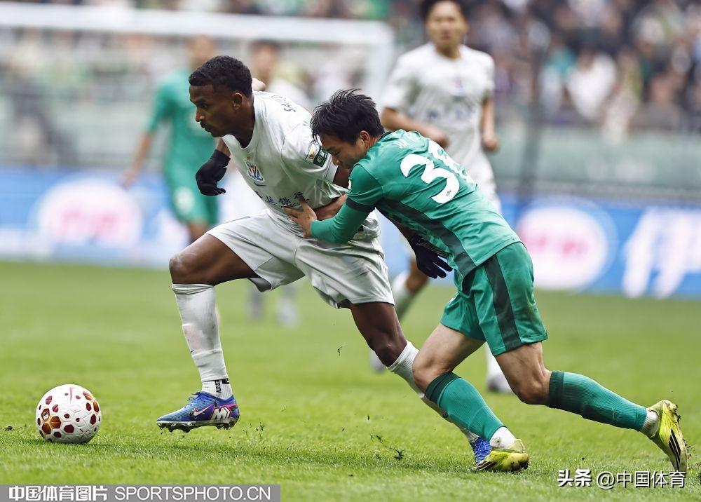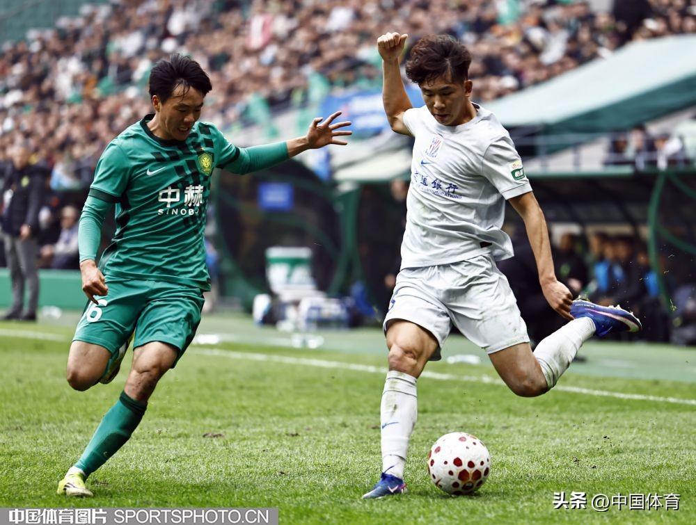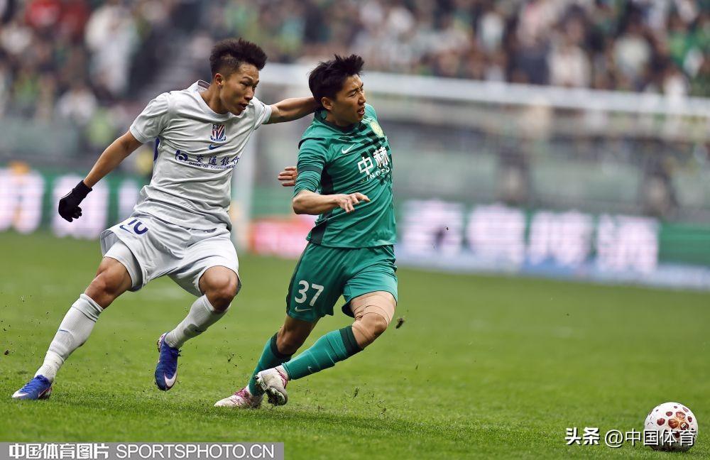 北京國安隊賈非凡(左)防守上海申花隊朱辰傑