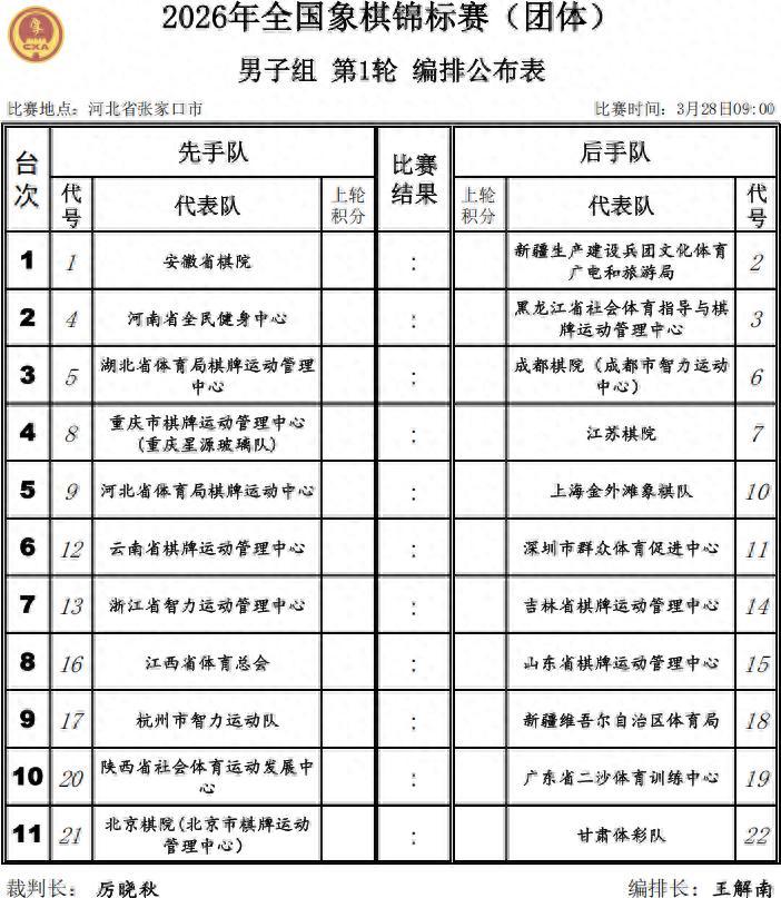 本次2026年全國象棋團體錦標賽,由國家體育總局棋牌運動管理中心、中國象棋協會主辦,河北省體育局棋牌運動中心、河北省象棋協會、張家口市體育局承辦,張家口興垣體文旅運營管理有限公司協辦。