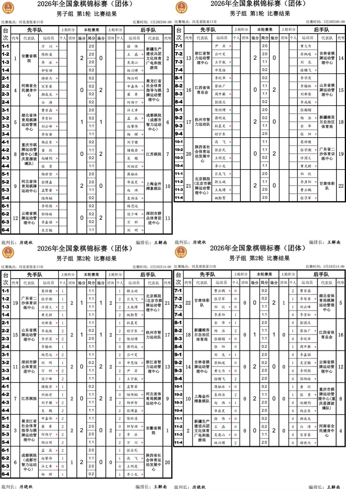 第二輪四川孟辰、許文章雙勝,贏下陝西,湖北隊曹巖磊、李智屏同樣雙勝,擊敗甘肅。