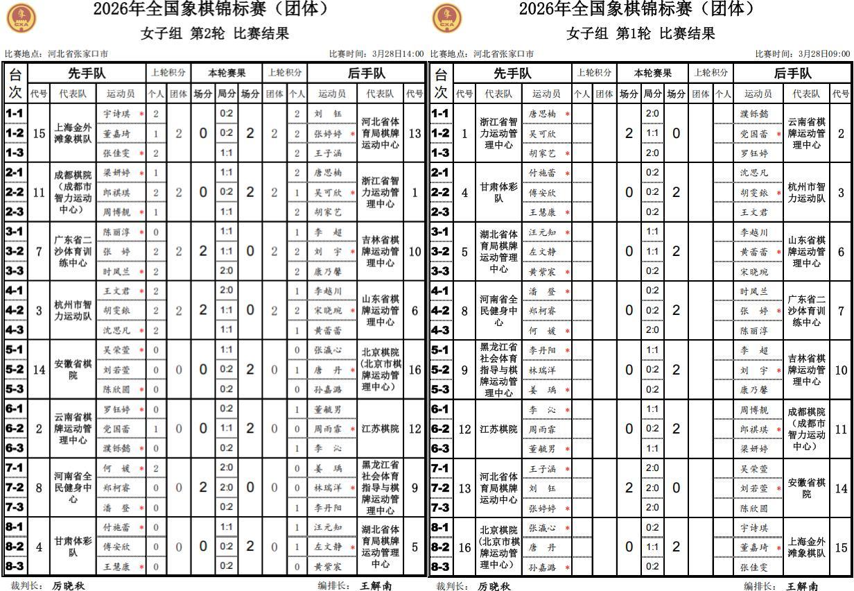 女子組兩輪後河北、廣東、浙江、杭州4分,北京、四川、上海、江蘇、湖北、山東、吉林、河南2分,黑龍江、雲南、安徽、甘肅0分。