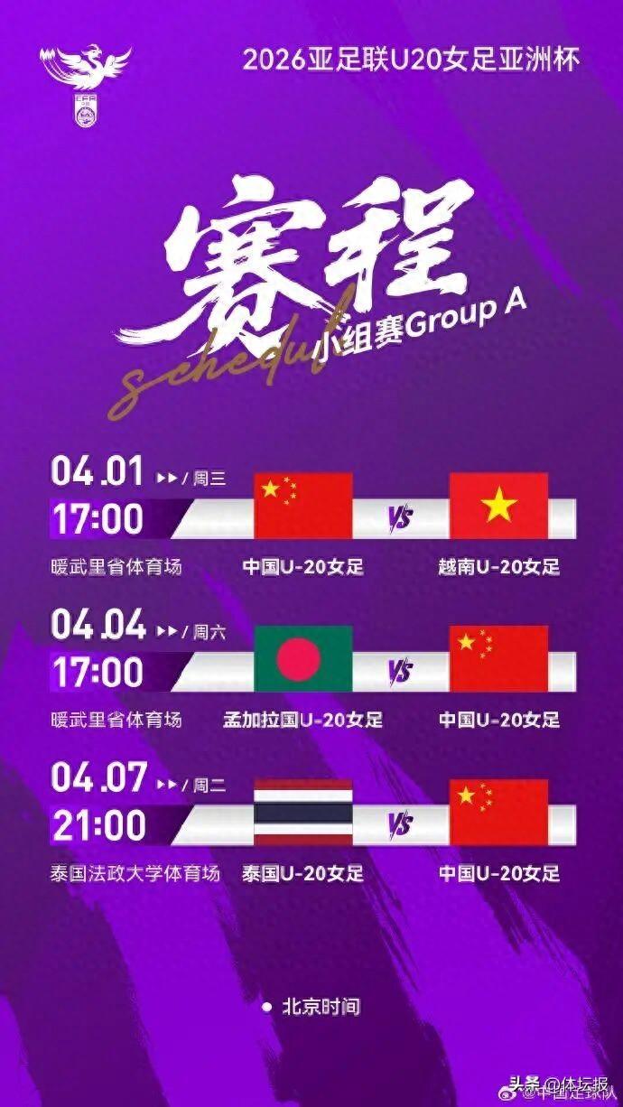 3月29日,中國足協公佈了2026年亞足聯U20女足亞洲盃賽中國隊小組賽具體比賽時間。