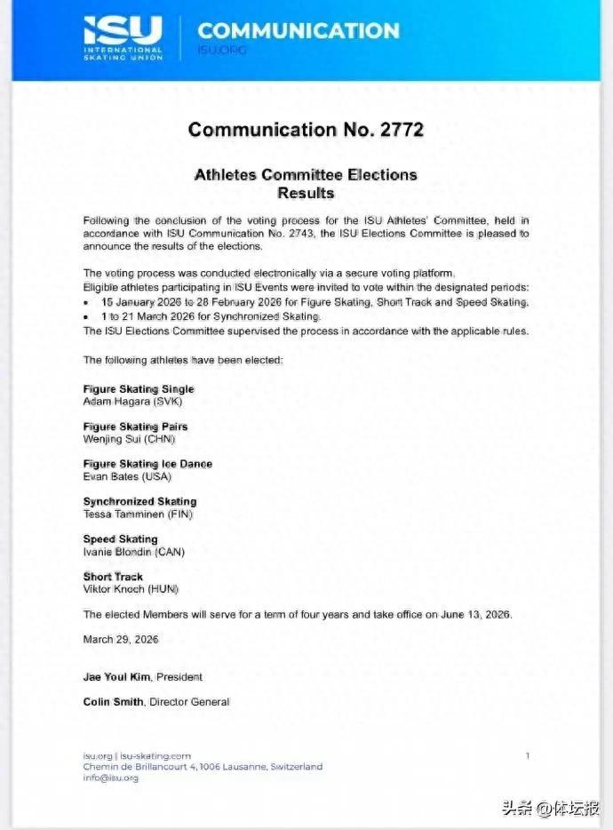 北京時間3月30日,國際滑冰聯盟公佈運動員委員會委員競選結果。中國花樣滑冰運動員隋文靜成功當選國際滑聯運動員委員會委員,將於6月13日正式履職,任期四年。