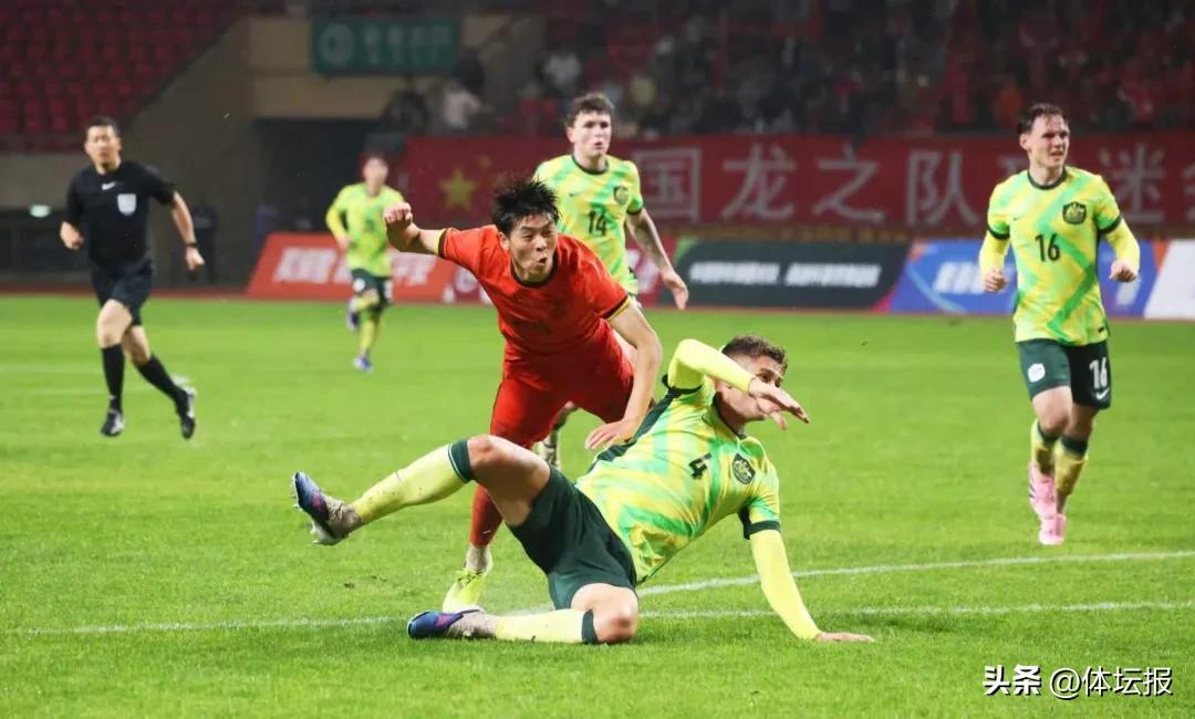 雨戰中,中澳兩支青年軍爲現場球迷奉獻了一場節奏極快的對抗。