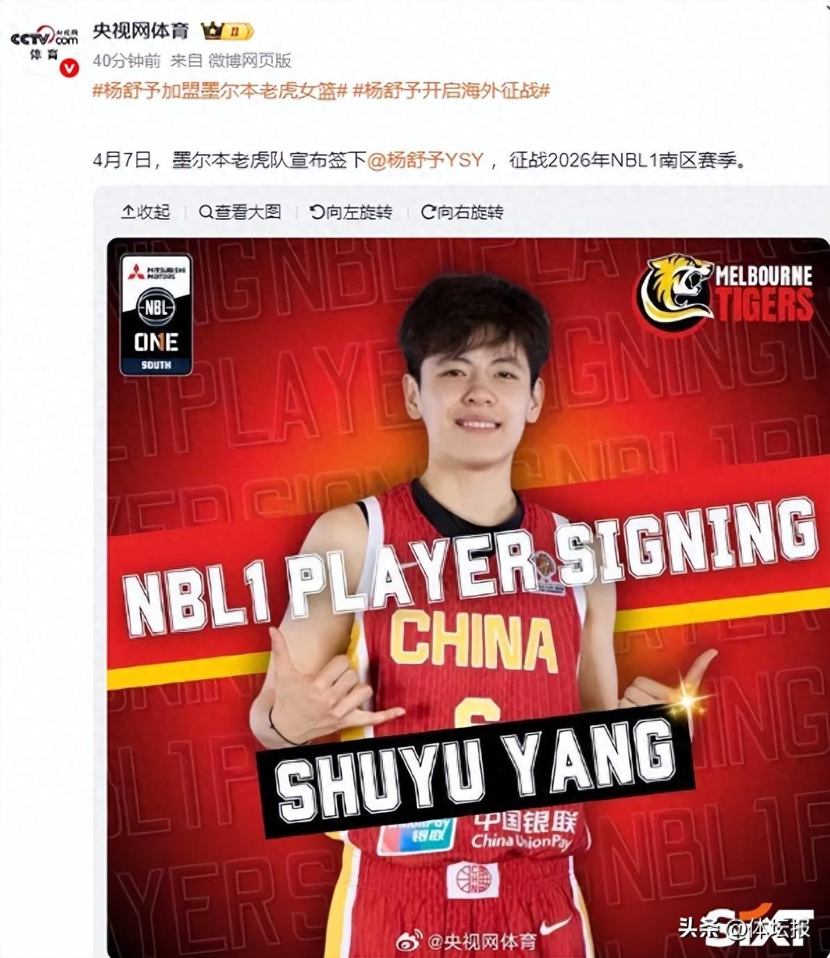 4月7日,澳大利亞NBL1聯賽墨爾本老虎隊宣佈,中國女籃球員楊舒予加盟該隊,將出戰2026賽季NBL1南區聯賽。24歲的楊舒予就此開啓個人首次留洋之旅。