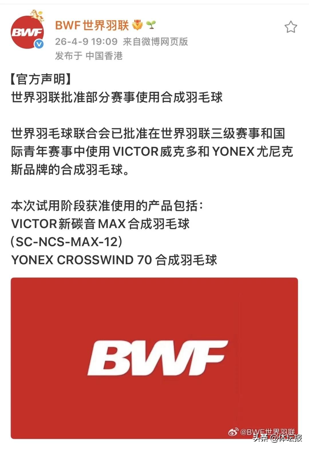 4月9日,世界羽聯發佈官方聲明,批准在世界羽聯三級賽事和國際青年賽事中使用VICTOR威克多和YONEX尤尼克斯品牌的合成羽毛球。