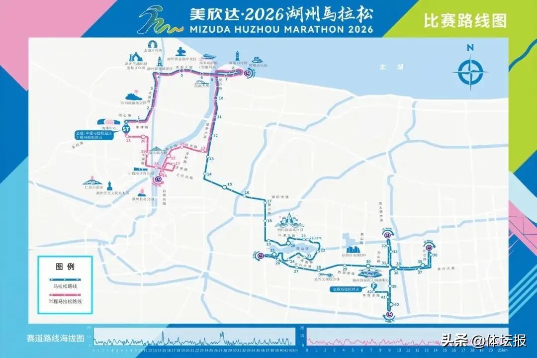本屆賽道在上屆線路中優化升級,起點設在湖州市奧體中心,全馬終點抵達湖州國際紅土網球中心,半馬終點則回到奧體中心。賽道全新優化後,沿途將跑過國家5A級太湖旅遊度假區、湖州影視城、邱城遺址等景點,串聯起湖光、新城與春意,爲跑者帶來獨特的奔跑體驗。
