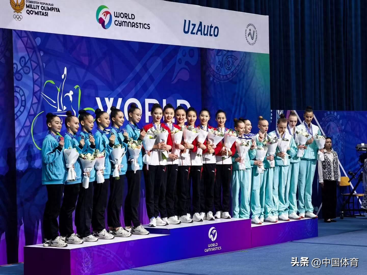 在備受矚目的集體全能決賽中,由丁欣怡、劉妙婷、蒲彥竹、王瀾靜、張馨藝、趙婉竹組成的中國隊發揮完美,以總分55.90分,領先第二名哈薩克斯坦隊將近5分的絕對優勢奪得金牌。後者以51.25分獲得銀牌。