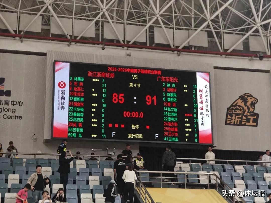 4月12日晚,浙江浙商證券男籃在主場黃龍體育館再度迎來老對手廣東東陽光男籃。最終,浙商證券男籃85:91負於廣東東陽光男籃,遭遇本賽季主場首敗。此役,浙商證券男籃五人得分上雙,布朗拿下全隊最高的21分,胡金秋得到16分;廣東男籃三人得分上雙,奎因砍下全場最高的29分。