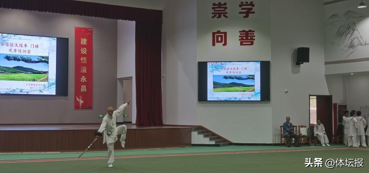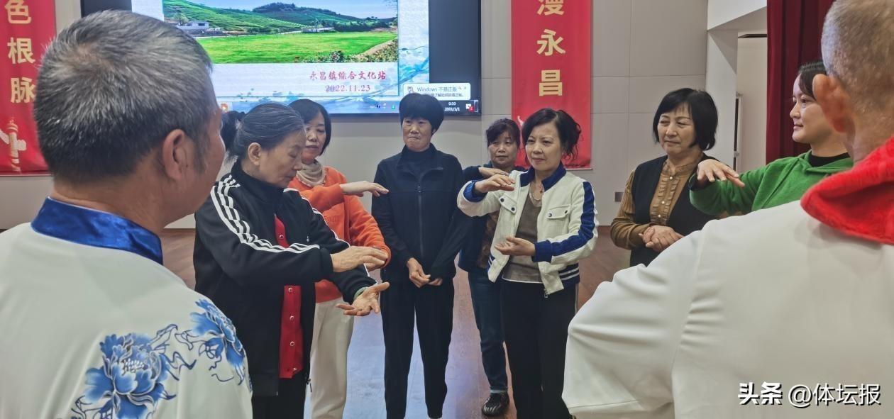永昌村前年在村養老中心建成2片標準門球場,開放村民文體大舞臺,堅持打門球、學練太極拳、舞龍健身運動的中老年村民越來越多,部分村民去年剛學會“八法五步”太極拳,所以對今天的太極拳活動早就期待,希望學有所得。在村家宴中心的禮堂裏,在許多熱情村民簇擁觀摩中,小分隊10 位高手身着白底青花太極服,依次向村民們行禮,在臺上臺下襬開了太極道場,他們分別展演“八法五步”太極拳、24式太極拳、32式太極劍、陳式太極劍等。小分隊10 位高手在剛剛落幕的2022年浙江省老年太極拳(劍)比賽中榮獲集體項目一個第一,個人單項六個第一的驕人成績。給富陽太極人很大的鼓舞。
