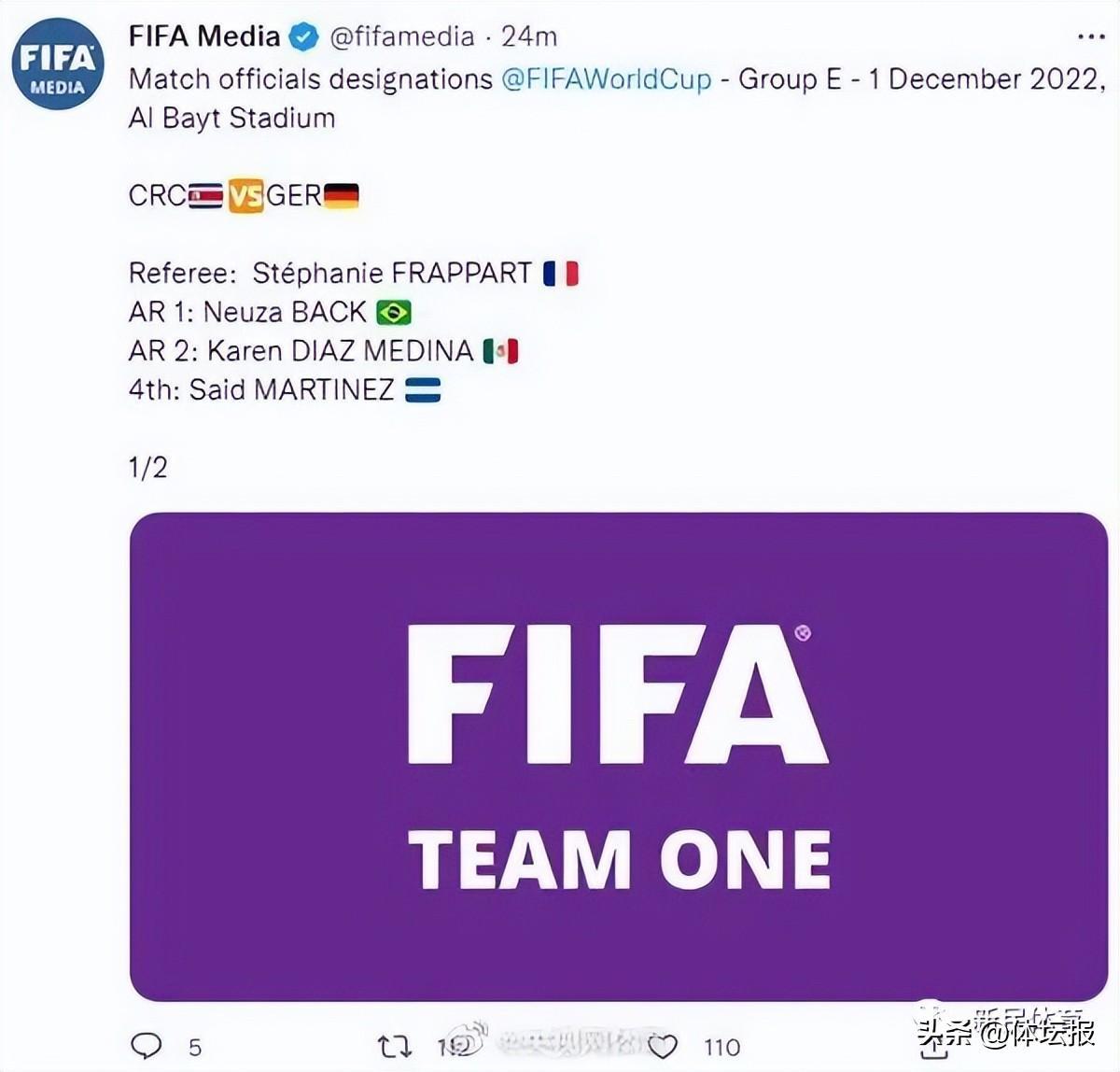 38歲的法國裁判員斯蒂芬妮·弗拉帕爾創造了歷史。德國與哥斯達黎加的小組生死戰,她將作爲主裁執法。世界盃92年曆史上,迎來了首位女主裁。