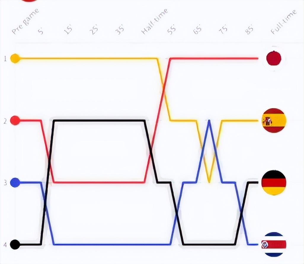 而回到實際比賽,下半場70分鐘,從德國丟掉第2球開始,死亡之組竟然出現了3分鐘的“逆天劇本”:日本和哥斯達黎加排名前二。