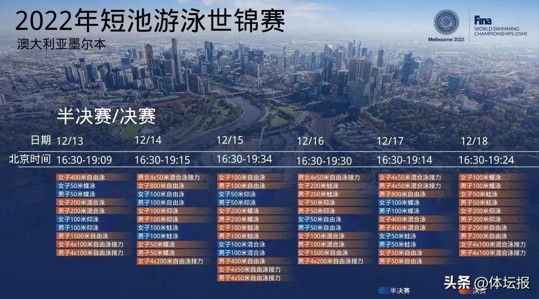 根據賽程安排,本屆短池世錦賽將於12月13日-18日進行。去年12月在阿聯酋阿布扎比進行的2021年短池游泳世錦賽上,中國隊獲得4金1銀2銅,並列金牌榜第四,其中李冰潔一人奪得2金。期待中國軍團鍛鍊隊伍的同時也取得佳績,實現雙豐收,爲2022年征程畫上完美句號。