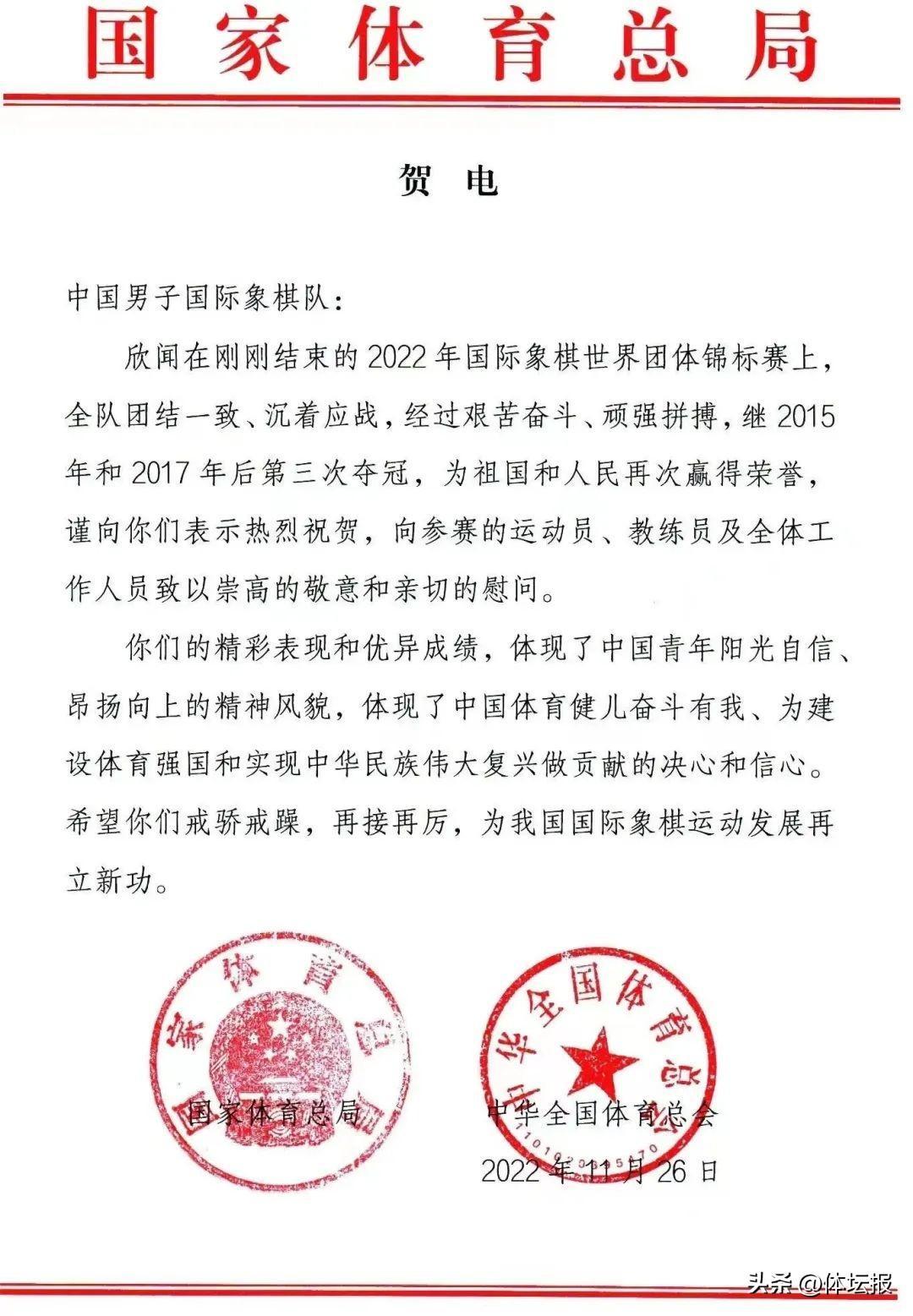國家體育總局、中華全國體育總會向隊伍發來賀電。