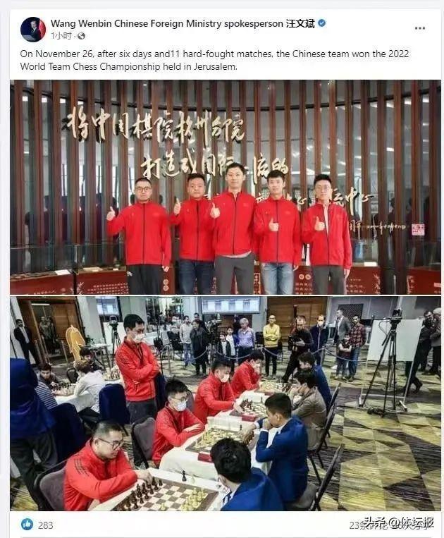 近日,中國國際象棋隊結束了2022年國際棋聯男子世界團體賽的征戰回到國內。此番,由溫陽、許翔宇、白金石、盧尚磊、李荻五位棋手組成的中國代表隊以兩個2.5比1.5戰勝烏茲別克斯坦隊,收穫冠軍獎盃,西班牙隊、印度隊分獲第三和第四名。這也是中國男子國際象棋隊繼 2015年和 2017 年後第三次奪冠。