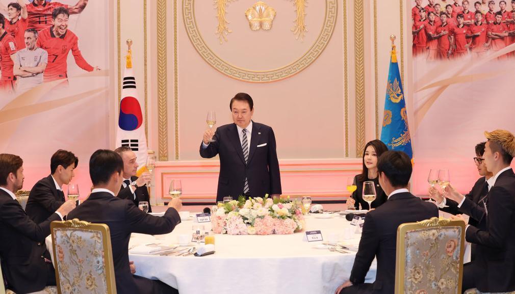 雖然韓國隊在世界盃淘汰賽首輪慘敗給巴西,遺憾出局,但能夠進入16強階段,對於這支“太極虎”來說,已經是圓滿完成任務了,所以回到韓國國內,這幫世界盃球員們還是得到了最高禮遇,全體將士受韓國總統尹錫悅邀請,出席晚宴。