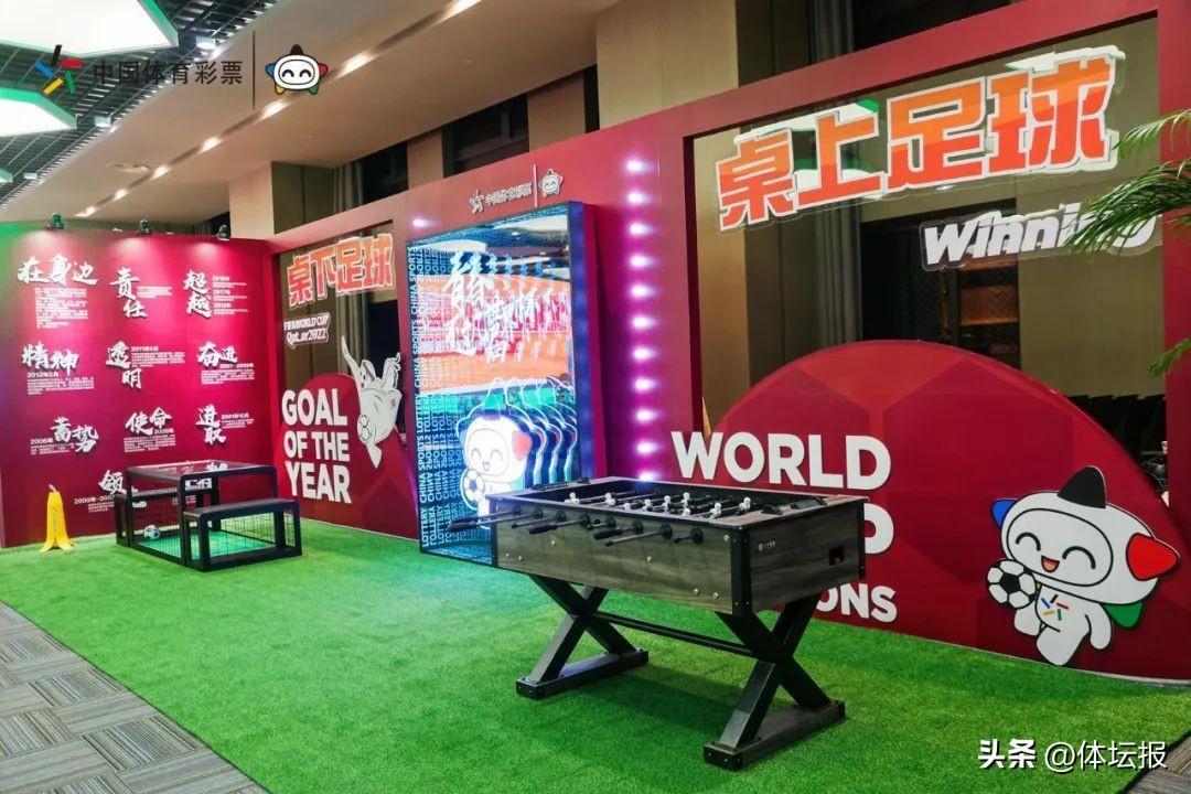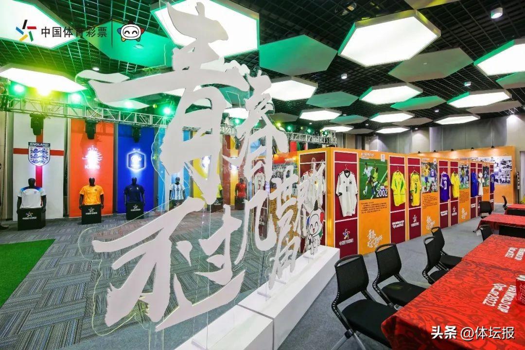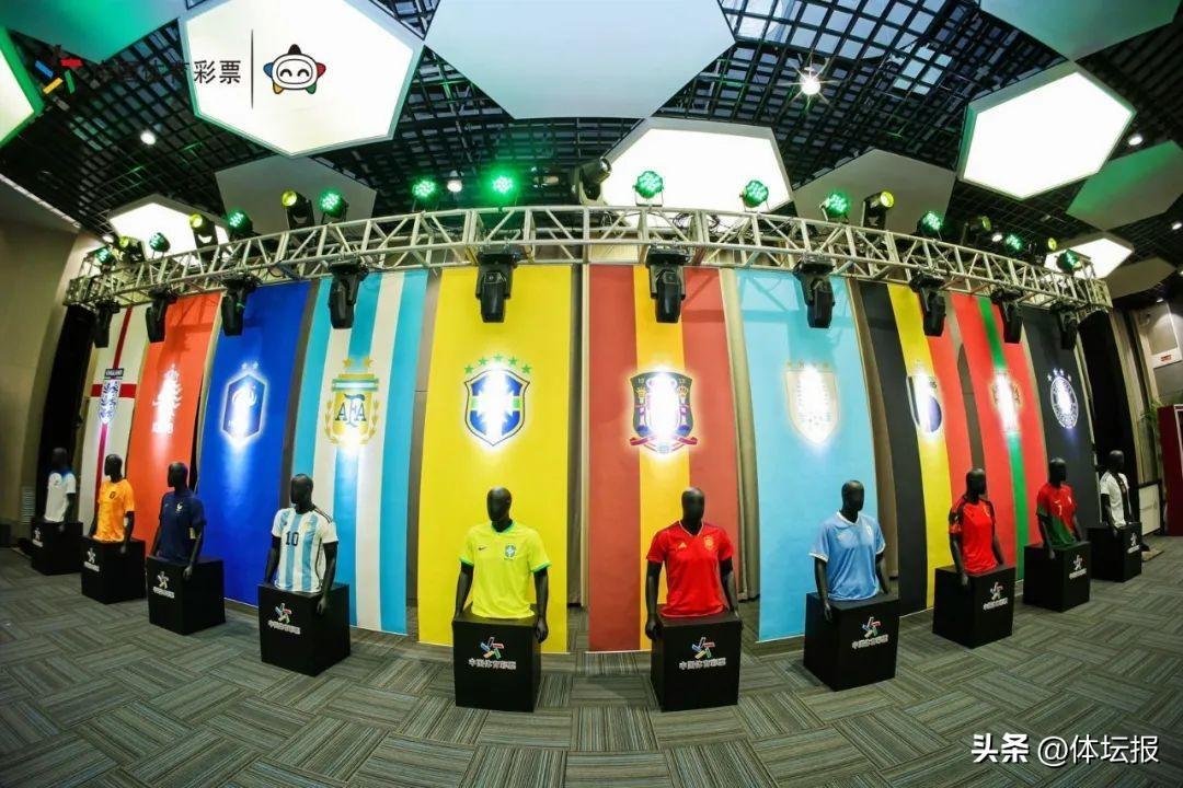 再往裏,本屆世界盃十大豪強的參賽球衣、各國隊徽呈一字排開,頂部射燈映射,氣勢十足,合影打卡絕佳。光看不過癮的,可以去體驗區試試身手:桌上動動手、桌下動動腳、我是球王電競遊戲,總有一款適合你。