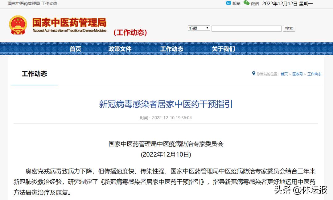 12月10日,國家中醫藥管理局正式發佈《新冠病毒感染者居家中醫藥干預指引》。