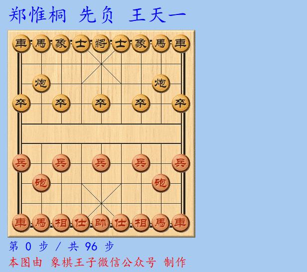 兩人決賽,鄭惟桐執先手擺下中炮陣,王天一應以屏風馬,佈局雙方形成了一箇中炮巡河車七兵對屏風馬7卒右炮過河的變化。