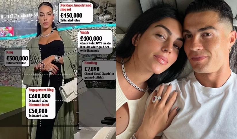 光是喬治娜脖頸上佩戴着銀色的項鍊,就價值45萬美金,此外右手上的戒指,大的60萬美金,小的也要5萬美金,而左手上戒指價值也有30萬美金的顧家,然後就是手提包,看似比較普通,也超過了7000美金,鑽石手環也非常昂貴,大概在40萬美金。所以粗略估算一下,喬治娜隨隨便便出現在世界盃看臺上,一身的穿搭配飾總金額,就在180萬美金,這是何等的奢靡。
