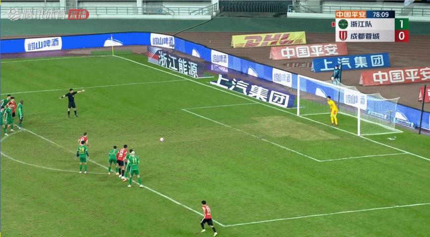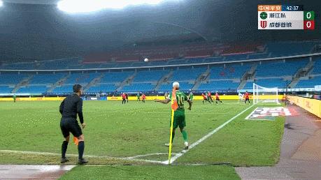 上半場臨近結束時,成都獲得禁區前沿任意球,羅慕洛直接打門被浙江隊人牆擋出底線,浙江隊成功帶着一球優勢進入下半場。