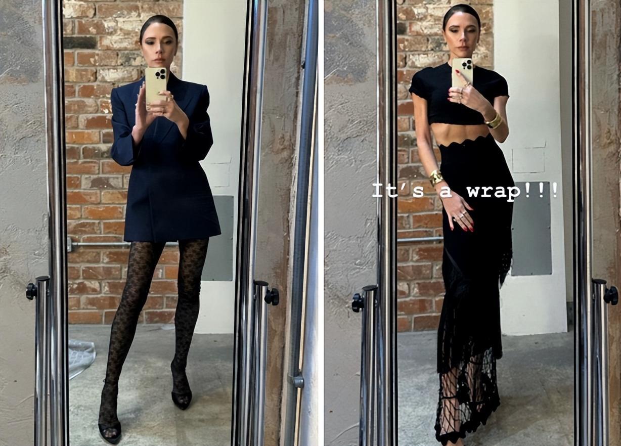 維多利亞在鏡子前換了好幾套裝扮,有藍色小西服搭配黑絲,也有一件黑色露腰長裙,秀出極致馬甲線,還有性感吊帶裝,貝嫂的手臂肌肉線條清晰可見。