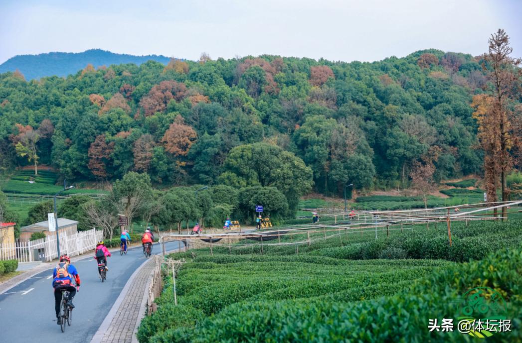 此次自行車騎遊活動以龍塢茶鎮·九街作爲起終點,全程約7公里。沿途山水環抱、茶園連綿,參與者需要在一路上打卡紅色地標外桐塢村的朱德紀念室,遊覽擁有杭州首條標準山地車賽道的何家村騎行公園,與龍塢茶鎮地標大茶壺雕塑合影,目光所及之處皆是風景。