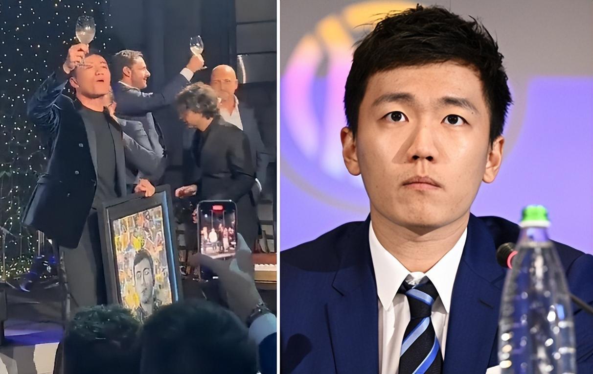 值得一提的是,這次國際米蘭的聖誕聚餐,中國老闆張康陽也是盛裝出席,情緒到位,他一手端着香檳酒,另一隻手拿着自己的肖像畫,在舞臺上手舞足蹈,大聲吶喊,甚至還舉杯高唱:“我們是國際米蘭!”