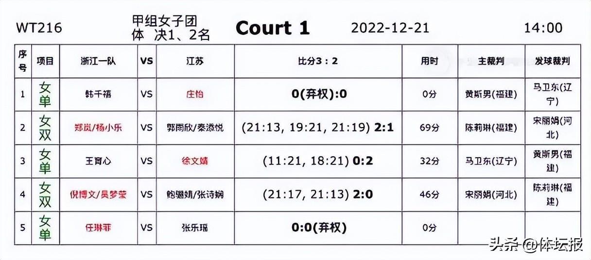 12月21日晚,在福建廈門收拍的全國羽毛球錦標賽女團甲組決賽,浙江一隊3∶2戰勝江蘇隊奪得冠軍。這是繼2014年之後,時隔8年再捧全國錦標賽女團冠軍獎盃。