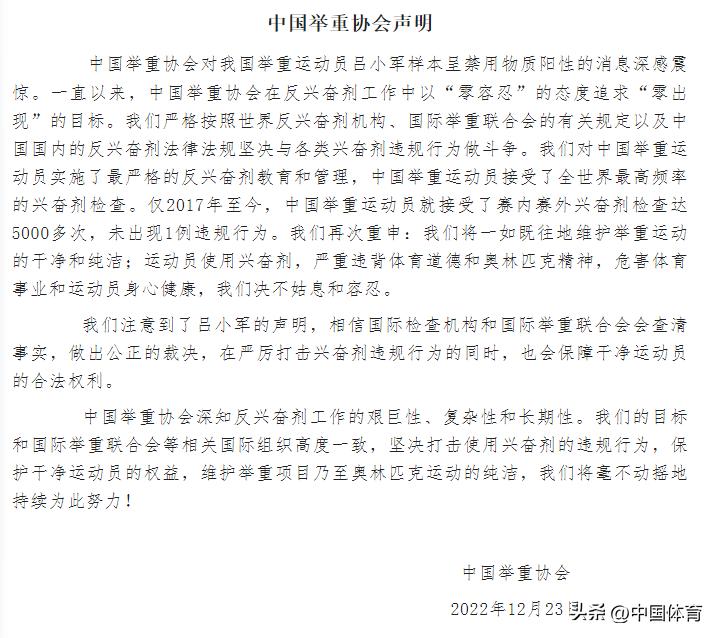 中國體育訊 12月23日,在三屆奧運會舉重冠軍呂小軍就興奮劑檢測呈陽性發布個人聲明後,中國舉重協會也發佈了聲明。全文如下: