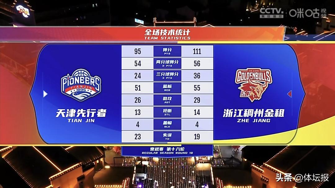 12月26日,CBA第18輪,浙江稠州金租男籃迎戰天津男籃的挑戰。此前,天津男籃已經12連敗,但是本場比賽,天津男籃在上半場展現出了非常高的技戰術水平,一度壓制浙江稠州金租男籃,而且數度領先。但從第三節下半段開始,浙江稠州金租男籃展現出了實力,將比分拉開。最終,浙江稠州金租男籃涉險過關,以111:95拿下比賽。
