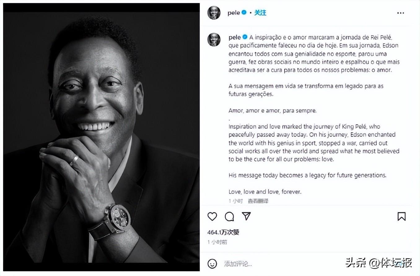 貝利去世後,他的個人社交媒體賬號寫道:“球王貝利今天安詳地離世了。愛與鼓舞人心,是他整個人生的標誌。埃德松(貝利原名)用他在體育領域的天賦終止過一場戰爭,他前往全世界參加社會活動,並傳播着他心中堅信的、解決所有問題的關鍵——那就是愛。貝利的故事在今天,成爲未來幾代人的寶貴遺產。愛,還是愛,一直去愛,直到永遠。”
