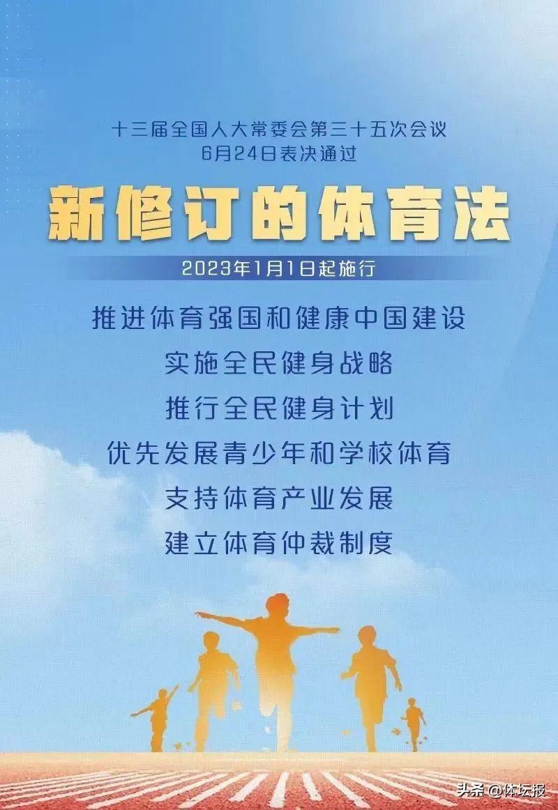 6月24日,《中華人民共和國體育法》由十三屆全國人大常委會第三十五次會議修訂通過,將於2023年1月1日起施行。這是該法自1995年頒佈施行後,時隔27年後進行的第一次全面系統的修訂。