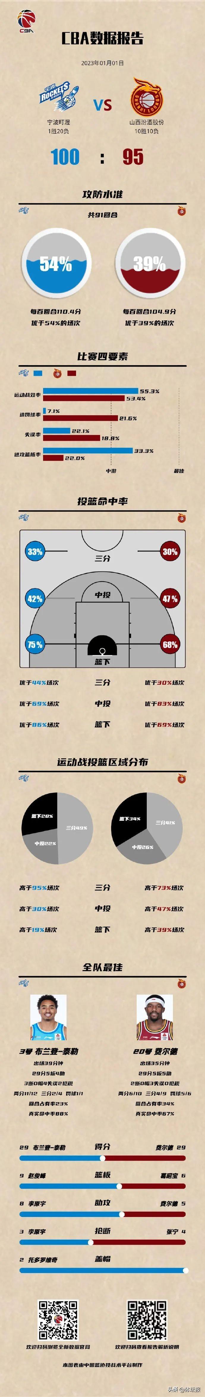 此役,寧波四人得分上雙,泰勒砍下全場並列最高的29分,成爲球隊獲勝的最大功臣,小將趙俊峯拿下20分創造個人生涯單場得分新高。除此之外,寧波在三分命中率、罰球命中率、籃板、助攻等多項數據均優於對手。