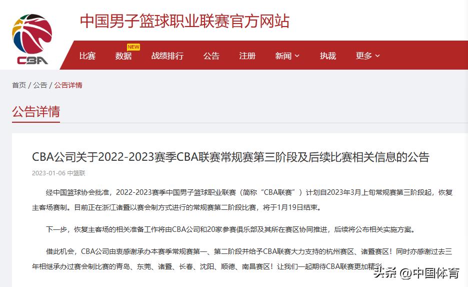 中國體育訊 1月6日,CBA官方發佈公告稱,經中國籃球協會批准,2022-2023賽季中國男子籃球職業聯賽(簡稱“CBA聯賽”)計劃自2023年3月上旬常規賽第三階段起,恢復主客場賽制。目前正在浙江諸暨以賽會制方式進行的常規賽第二階段比賽,將於1月19日結束。下一步,恢復主客場的相關準備工作將由CBA公司和20家參賽俱樂部及其所在賽區協同推進,後續將公佈相關實施方案。(完)