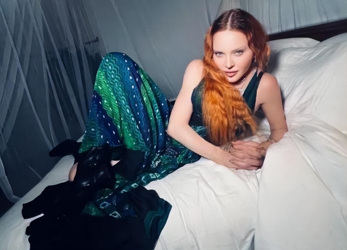 特別是當麥當娜穿着一條綠色花紋的長裙躺在牀上擺拍時,年輕時候的風味撲面而來,她依然還是那個“女王”,性感嫵媚,氣場十足。值得一提的是,麥當娜正在祕密策劃包括在倫敦公演在內的40週年精品巡演,已經64歲的年齡,還是這麼活力四射,精神飽滿,實在讓人佩服。